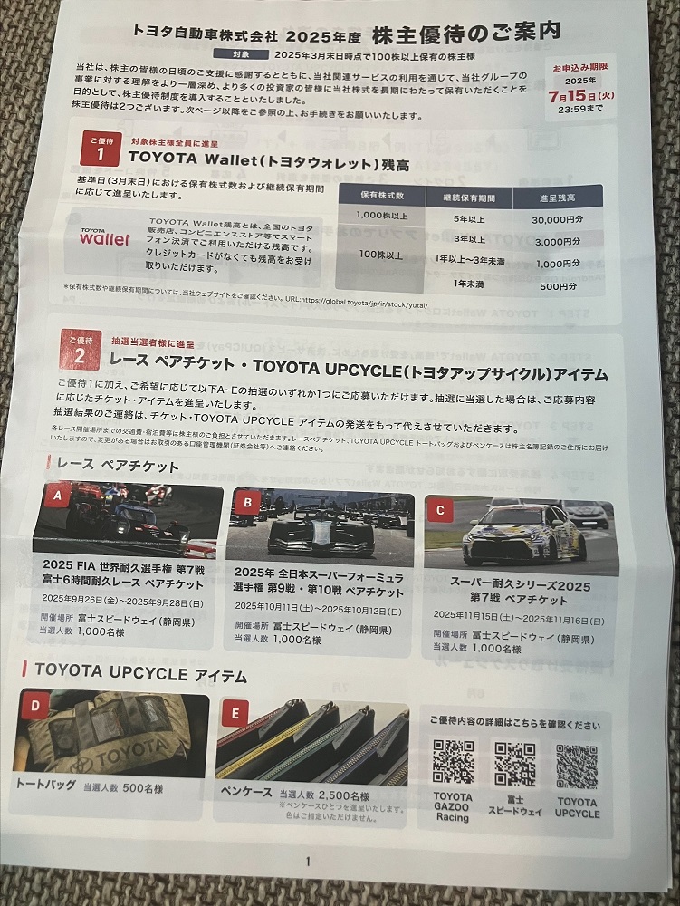 トヨタ自動車から株主総会通知とともに、今年から新設された株主優待の案内が届きました。大きく2つあって